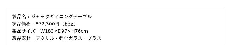 ジョナサン・アドラーで人気のジャックコレクションのダイニングテーブル。クリアアクリルのフレームにブラッシュドブラスのコーナー金具、天板に強化ガラスを組み合わせた「シンプルとグラマーの均衡」をそのままかたちにしたデザインです。幅約183cm × 奥行約97cm × 高さ約76cmで最大6名に対応し、住宅だけでなくコントラクト(業務用)環境にも適しています。視覚的な圧迫感を与えないアクリルの透明感は、空間を広く演出しながらも、ブラスの光沢が確かな存在感を加えます。「モダンアメリカングラマー」を体現する、ダイニングの象徴的なアイテムです。