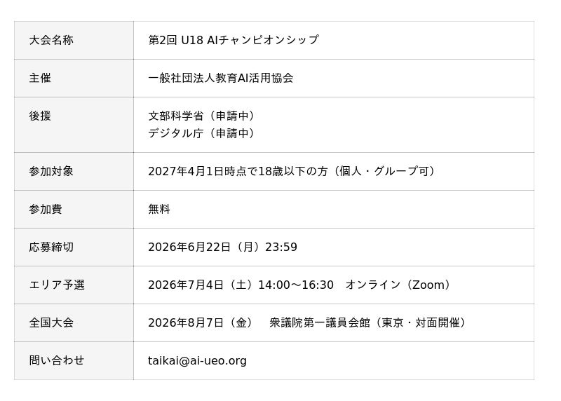 一般社団法人教育AI活用協会(所在地:東京都港区/代表理事:佐藤雄太)は、18歳以下を対象とした全国規模のAIプレゼンテーションコンテスト「第2回 U18 AIチャンピオンシップ」を2026年8月に開催することを発表いたします。