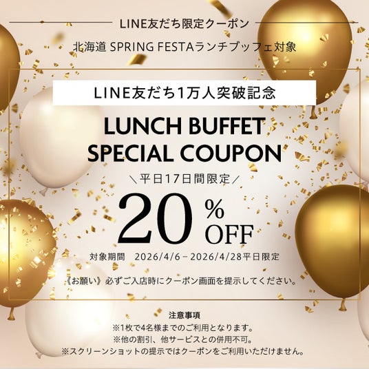 ANAクラウンプラザホテル成田(成田市堀之内 総支配人 ダヴィデ・ザナルディ)では、LINE友だち1万人達成を記念して本日4月6日(月)よりご利用いただける『平日限定ランチブッフェスペシャルクーポン』を配信しております。
