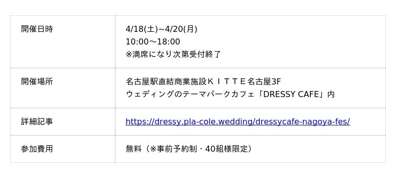 「PLACOLE & DRESSY」ブランドを展開する、冒険社プラコレ(本社:神奈川県鎌倉市、代表取締役CEO:武藤功樹)は、名古屋駅直結商業施設KITTE名古屋3F、ウェディングのテーマパークカフェ"DRESSY CAFE"にて、4/18(土)~4/20(月)の3日間限定で、これから結婚式をお考えのカップル様に向けた、個室相談やウェディングドレス試着ができる豪華特典付きのウェディング初体験フェスを開催いたします。(40組様限定、無料開催)