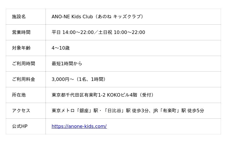 場所:ANO-NE Kids Club(東京都千代田区有楽町1-2 KOKOビル4階)