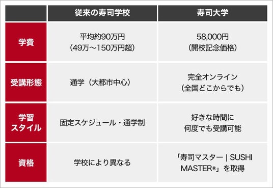 全日本寿司連盟協会(J.S.F.A)の総監修のもと、完全オンライン型の寿司教育サービス「寿司大学(R)」が2026年4月7日(火)に開校いたします。受講料は58,000円(税込・開校記念価格/通常65,000円)。寿司の技術だけでなく、魚介の専門知識、開業・経営、所作・接客までを一つのプラットフォームで体系的に学べる、これまでにないオンライン寿司学校です。運営は、国内最大級の寿司メディア「寿司ウォーカー」を手がける株式会社寿司ウォーカーが担います。