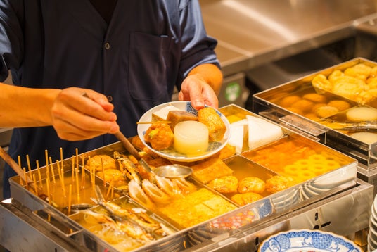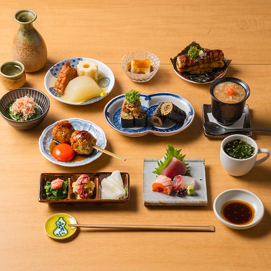 あごだしの原料であるトビウオは、海上を飛ぶように泳ぐため、雑味の原因になる脂肪分が他の魚より少なく、スッキリとした上品な味のお出汁が取れます。焼くことで旨味が凝縮され、香ばしい香りもまとった深みのあるお出汁になり、季節を問わずお楽しみいただけます。定番のラインナップ以外にも、旬の食材を使用した季節限定メニューを揃えています。1品100円(税込110円)~