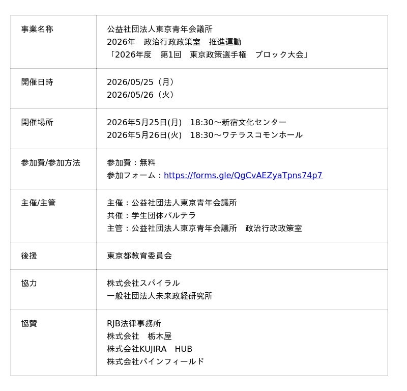 【参加無料】【2026年5月25日、26日】東京青年会議所、若者の政治参画を促す「第1回東京政策選手権」を開催