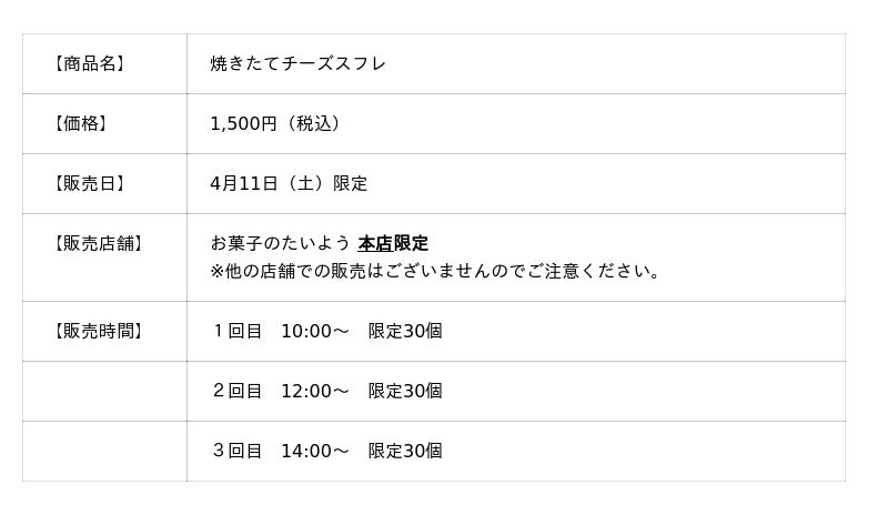 株式会社太陽社(所在地:千葉県匝瑳市飯倉293、代表取締役:片岡正裕)が展開する千葉県で長年愛される菓子店「お菓子のたいよう」は、毎年即完売となる大人気スイーツ「焼きたてチーズスフレ」を、4月11日(土)の1日限定で今年も販売いたします。ふわっふわ・ぷるんぷるん、そしてシュワっと消える独特の食感と濃厚なチーズの味わいでファンを魅了し続ける、"焼きたて"でしか味わえない特別なスイーツ。年に一度だけの特別なチャンスです。