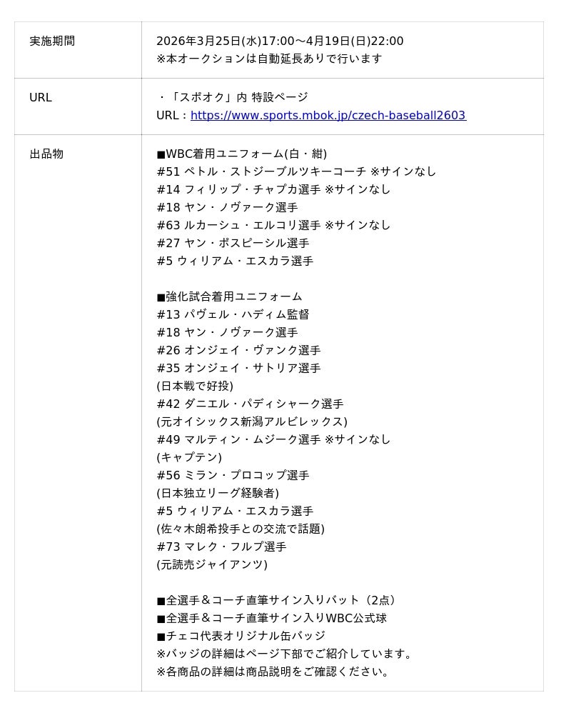 株式会社モバオク(本社:東京都渋谷区、代表取締役社長:小一原 宏樹、以下モバオク)がエンゲート株式会社(本社:東京都中央区、代表取締役:城戸 幸一郎、以下エンゲート)と業務提携し提供するスポーツチーム公式オークションサービス「スポオク」にて、WBCチェコ代表が実施する『チェコ代表 選手着用直筆サイン入りユニフォームオークション』を4月19日(日)まで開催中です。