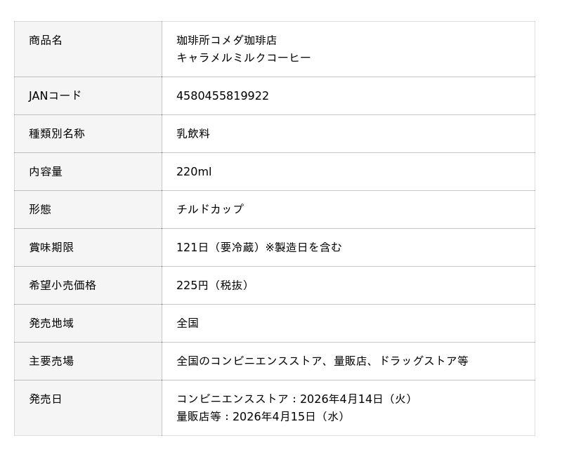 トーヨービバレッジ株式会社(本社:東京都渋谷区、代表取締役社長:熊谷聡)は、株式会社コメダ(本社:愛知県名古屋市、代表取締役社長:甘利祐一)と共同開発した「珈琲所コメダ珈琲店 キャラメルミルクコーヒー」と、「珈琲所コメダ珈琲店 ノンスイートミルクコーヒー」を2026年4月14日(火)より全国のコンビニエンスストア、4月15日(水)より量販店等にて順次発売致します(一部地域・一部店舗を除く)。