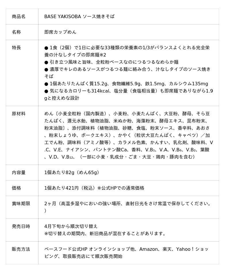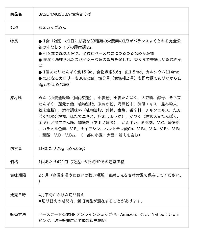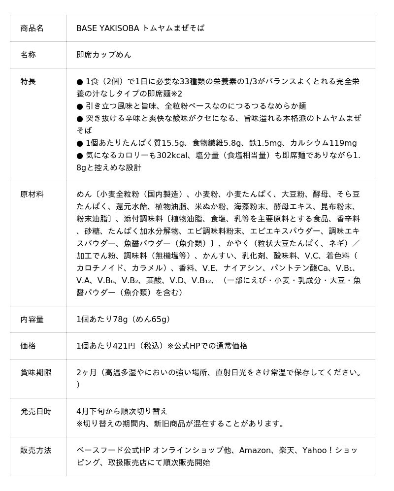 完全栄養の主食※1「BASE FOOD」等を開発・販売するベースフード株式会社(本社:東京都目黒区、代表取締役:橋本舜、https://basefood.co.jp)は、1食(2個)で1日に必要な33種類の栄養素の1/3がバランスよくとれる完全栄養の汁なしタイプの即席麺※2「BASE YAKISOBA(ベースヤキソバ)」シリーズの全種(「BASE YAKISOBA 魚介醤油まぜそば」「BASE YAKISOBA ソース焼きそば」「BASE YAKISOBA 塩焼きそば」「BASE YAKISOBA トムヤムまぜそば」)を4月中旬より順次リニューアルします。