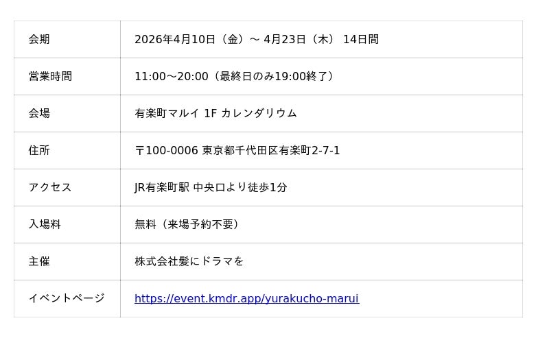 髪の質感にこだわる美容室発のヘアケアメーカー「髪にドラマを。」(本社:大阪府大阪市、代表取締役:川畑賢太)は、2026年4月10日(金)から4月23日(木)までの14日間、有楽町マルイにて、ポップアップストアを開催いたします。
