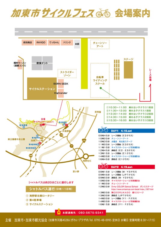 自転車レースのほかにも、4月18日(土)は和太鼓ステージ・名探偵プリキュア!ショー、4月19日(日)はダンスステージ・踊りステージ・レジェンド仮面ライダーショーといったステージイベント、また2日通してチェーンソーアートやライディングスクールも開催します。