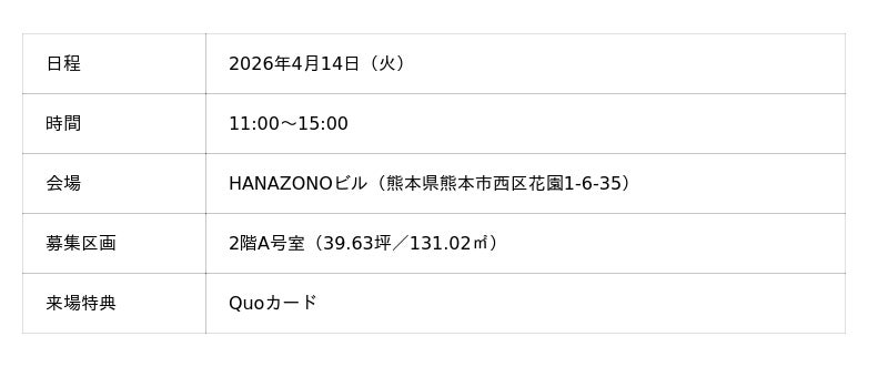 株式会社日商保(本社:東京都港区、以下「日商保」)、株式会社体育堂、株式会社コスギ不動産の3社は、「HANAZONOビル」(熊本県熊本市西区花園1-6-35)にて、2026年4月14日(火)に内覧会を共同開催いたします。