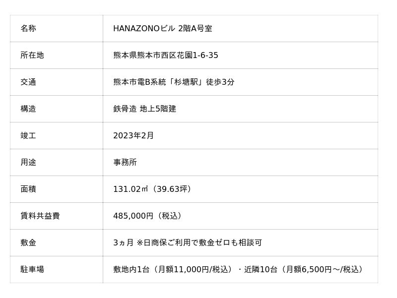 HANAZONOビルは2023年2月竣工の鉄骨造・地上5階建て。美麗でスタイリッシュな外観に加え、権限カードとエレベーターが連動する高度なセキュリティシステムを搭載し、24時間利用が可能です。募集区画の2階A号室は39.63坪のワンフロアで、熊本初進出・支店開設をお考えの法人様にも最適な規模です。