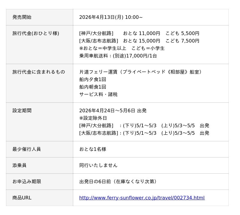さんふらわあトラベル株式会社(社長:大西 康人、本社:大阪府大阪市住之江区)は、4月13日(月)10:00からゴールデンウィーク期間の「さんふらわあスペシャルセール」を販売いたします。