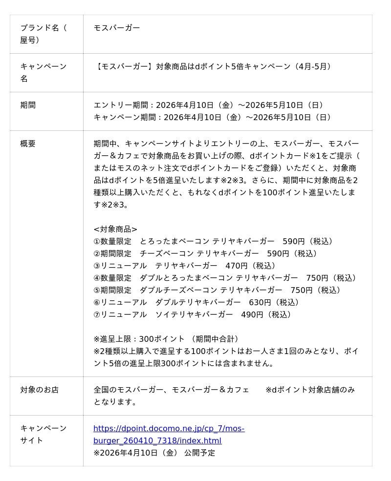 株式会社NTTドコモ(以下、ドコモ)は、モスバーガーにおいて、「対象商品はdポイント5倍キャンペーン(4月-5月)(以下、本キャンペーン)」を2026年4月10日(金)から2026年5月10日(日)まで開催いたします。
