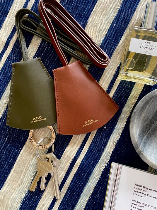 メタルリングと特徴的なレザーのベル型カバーが特徴。洗練されたタッチを加えながら、鍵をさりげなく隠します。首にかけるように設計され、実用性とミニマリストの美学が融合した、A.P.C.のシルエットへのこだわりが詰まったアイテムです。