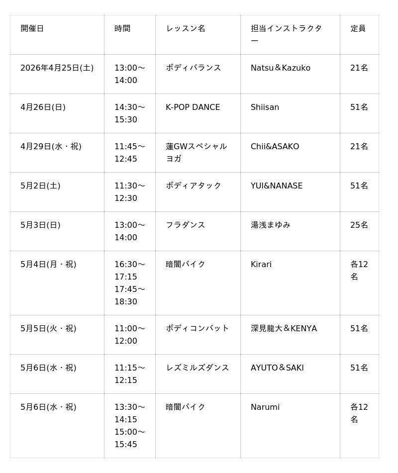 本イベントでは、「毎日がスペシャル体験!」と題して、人気インストラクターをお迎えし、日程ごとに異なる多彩なレッスンをご用意しています。ボディコンバットや暗闇バイクなどのハード系から、ヨガやフラダンスなどリラックス効果の高いレッスンまで、誰でも楽しめるバリエーション豊かなレッスンプログラムをお届けします。楽しみながら身体を動かすことで心身の健康を促進し、毎日の生活に新たなエネルギーを取り入れることができます。