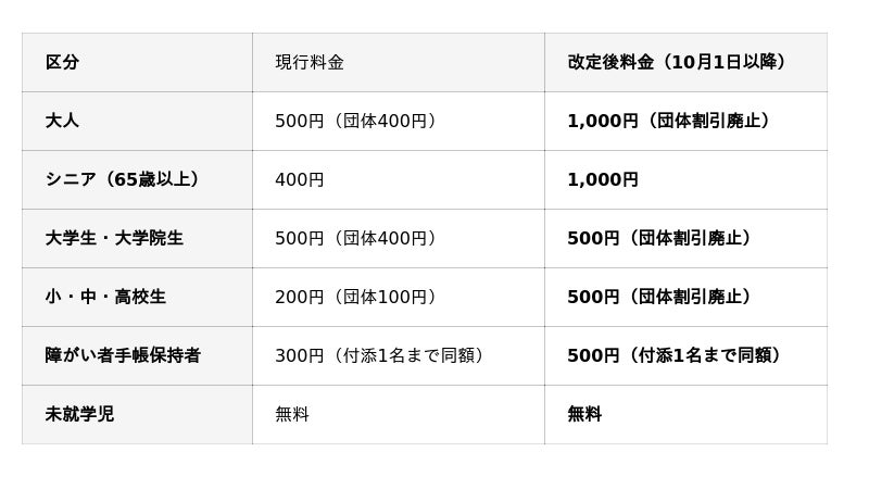 入館料改定内容(消費税込み)