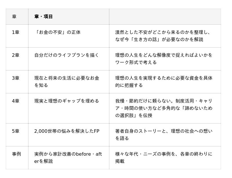本書は、読者が一歩ずつ自分の人生と向き合える「体験型」の構成となっています。「お金の不安の正体を知る」→「理想の人生を描く」→「現実とのギャップを埋める」という流れで、FPによるコンサルティングのプロセスを疑似体験できます。本書の構成