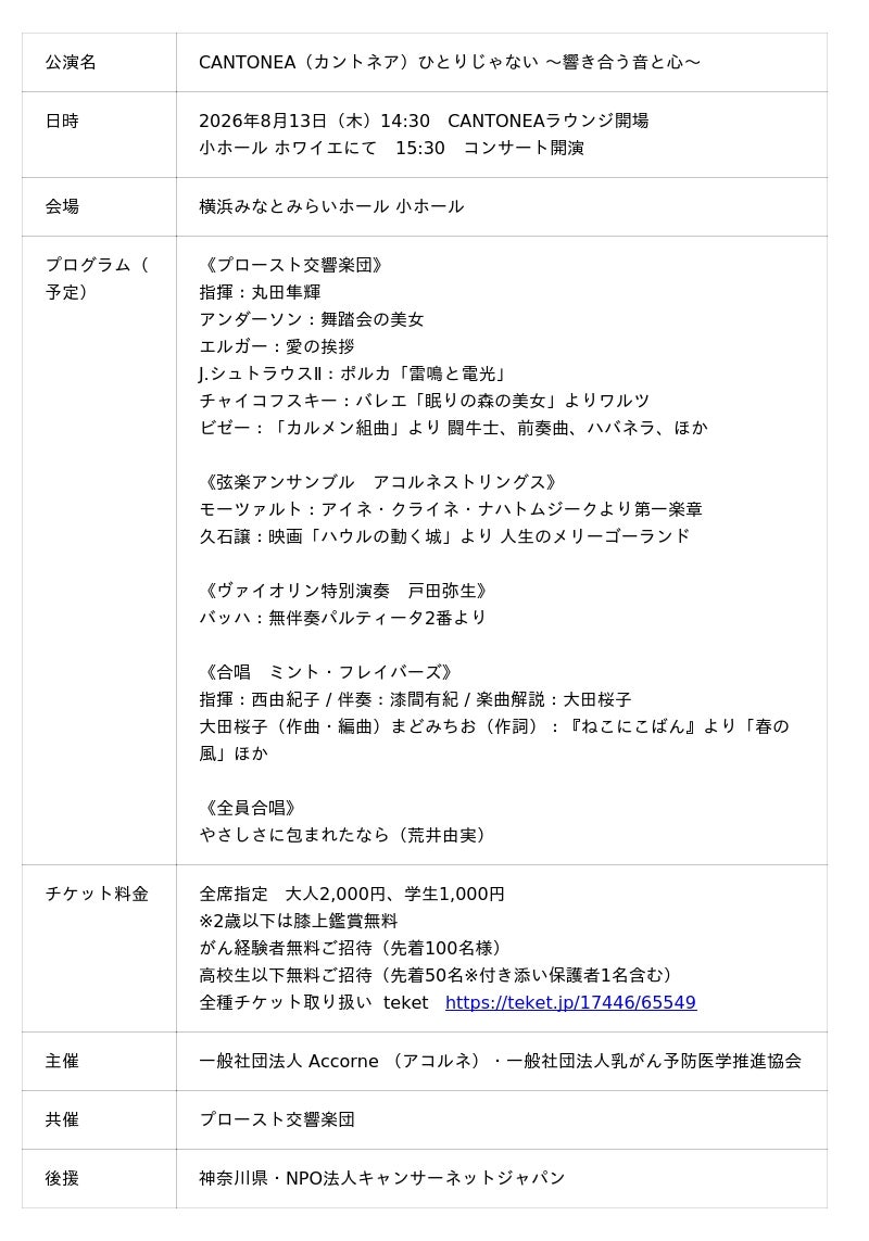 一般社団法人 乳がん予防医学推進協会、プロースト交響楽団、一般社団法人Accorne(アコルネ)は音楽を通じてがんと向き合う人々を支える共創型プロジェクト「CANTONEA(カントネア)」