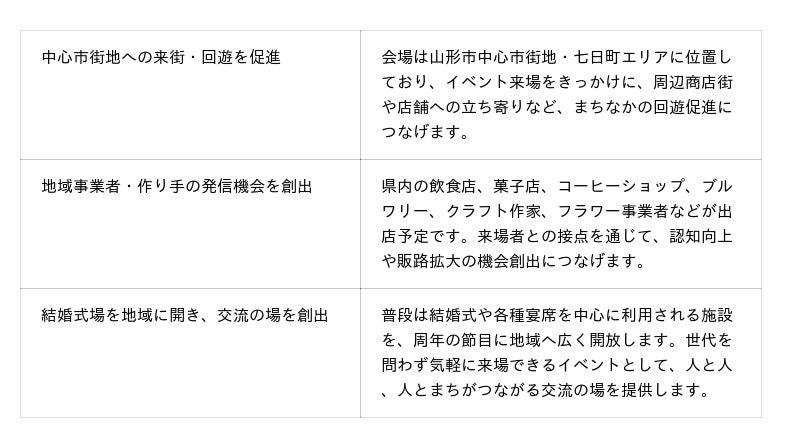本イベントは、地域の皆さまへの感謝をお伝えする周年企画であると同時に、七日町のにぎわい創出、回遊促進、地域事業者・作り手の発信機会創出を目的とした取り組みで、結婚式場を地域開放いたします。