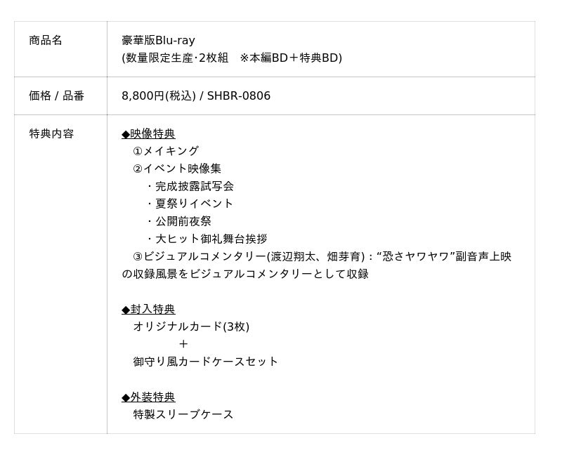 イベント映像集では、完成披露試写会、夏祭りイベント、公開前夜祭、大ヒット御礼舞台挨拶など大盛況で幕を閉じた数々のイベント映像を完全網羅。