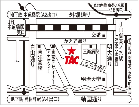 TAC水道橋校は、JR水道橋駅東口より徒歩8分、JR御茶ノ水駅御茶ノ水橋口より徒歩7分と近隣には2駅!都会なのに校舎周辺は静かで落ち着けて学習に向いた環境、少し歩けば学生街やオフィス街が広がっており、授業後の大学生や仕事終わりのビジネスマンがキャリアアップのために多数通っています。