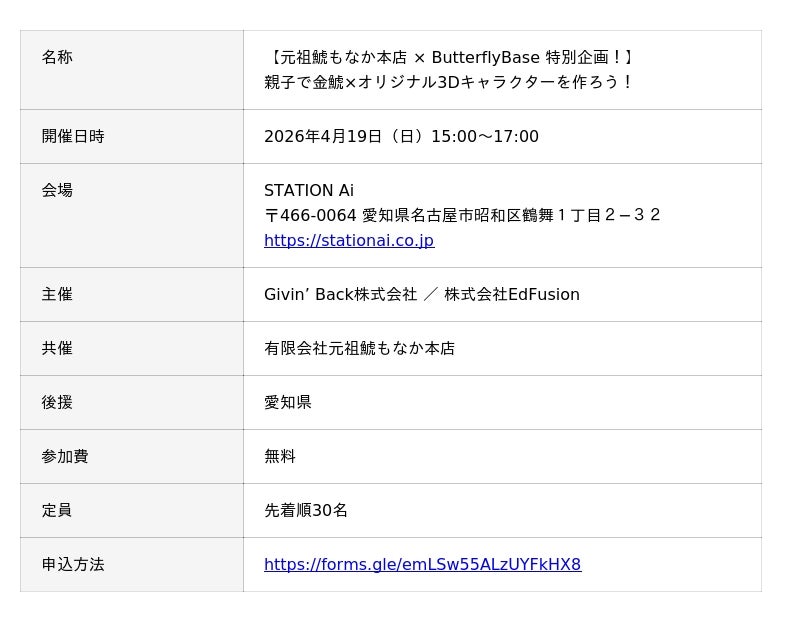 有限会社元祖鯱もなか本店(所在地:愛知県名古屋市中区松原2-4-8、代表取締役:古田花恵、以下「当社」)は、Givin' Back株式会社および株式会社EdFusionが主催する親子向け体験イベント「親子で金鯱×オリジナル3Dキャラクターを作ろう!」を、2026年4月19日(日)15:00~17:00にSTATION Aiで共催いたします。参加費は無料で、定員は先着30名です。