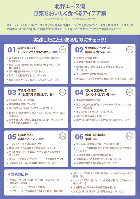 厚生労働省の「健康日本21(※3)」では、1日350g以上の野菜摂取が推奨されています。今回のドレッシング大賞をきっかけに、野菜をよりおいしく、たくさん食べてほしいという願いのもと全国のスタッフへ「野菜をおいしくたくさん食べるために心がけていること」についてアンケートを実施。集まった400件以上の回答から、「北野エース流 野菜をおいしく食べるアイデア集」を作成しました。ドレッシング大賞の特設ページでは、実際に北野エーススタッフが実践しているアイデア集を公開しています。ドレッシング大賞とあわせてぜひチェックリストでお楽しみください。