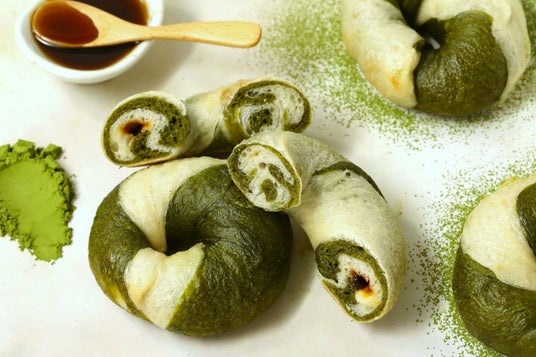こだわり:鮮やかな緑と白のマーブル模様が可愛らしい和テイストなベーグル。茶師が厳選した"一番