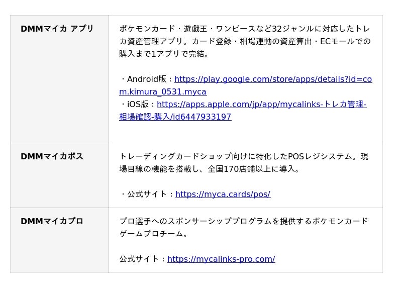 合同会社DMM.com(本社:東京都港区、以下「DMM」)は、トレーディングカード管理・購入アプリ「Mycalinks(マイカリンクス)」を運営する株式会社Myca(本社:茨城県つくば市、以下「Myca」)の発行済株式を取得し、子会社化したことをお知らせいたします。