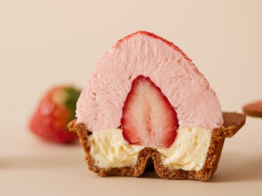 おすすめの食べ方は半解凍状態。ザクザクのクッキー、なめらかなムースの中から現れるのはひんやりとしたイチゴ。冷凍でお届けするからこそできた、フルーツアイスとチーズケーキの融合です。春の陽気に包まれながら口の中で溶けていくイチゴの食感をお楽しみください。