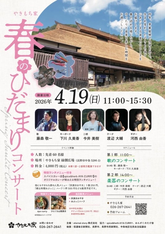互恵株式会社グループのeternal story株式会社 (本社:長野県長野市、代表取締役:村上達哉)が運営する「やきもち家」(長野県長野市中条日下野5286-1)では、2026年4月18日(土)・19日(日)の2日間、音楽と食を楽しむ特別イベント「囲炉裏端コンサート」および「春のひだまりコンサート」を開催いたします。
