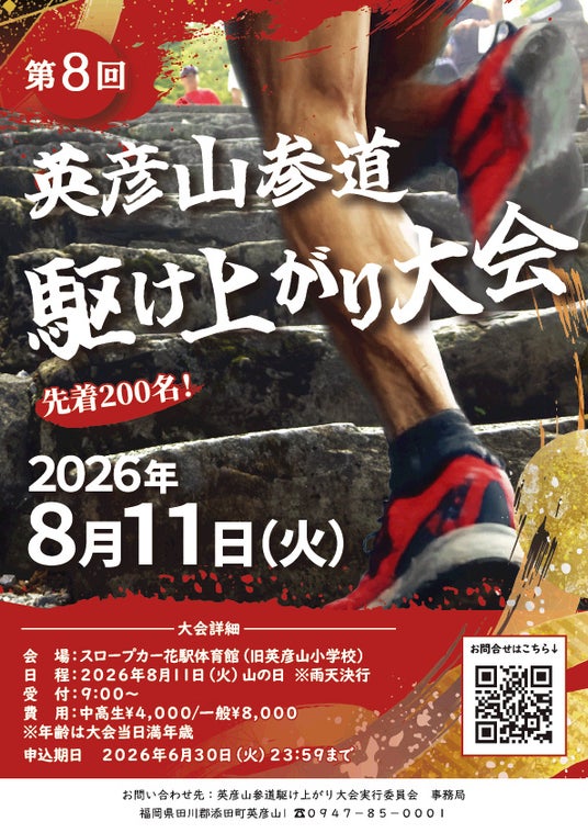 マラソンやトレランが好きな方はもちろん、「山の日」に何か新しい挑戦をしてみたい方、英彦山のパワーを全身で感じたい方。この夏、あなたも「最強の800m」に挑んでみませんか?
