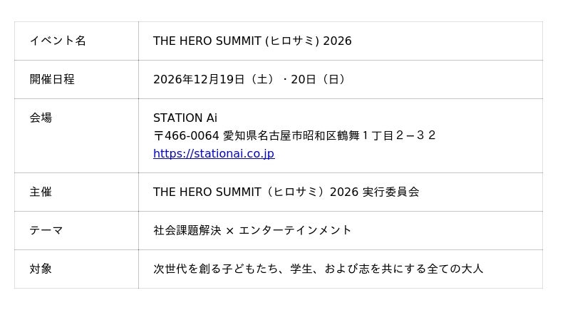 株式会社Meta Heroes(本社:大阪府大阪市、代表取締役:松石和俊)は、2026年12月19日(土)・20日(日)の2日間、愛知県名古屋市にある日本最大級のオープンイノベーション拠点「STATION Ai」にて、社会課題解決とエンターテインメントを融合した体験型サミット「THE HERO SUMMIT 2026(ヒロサミ)」を開催することをお知らせいたします。