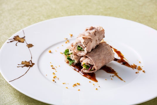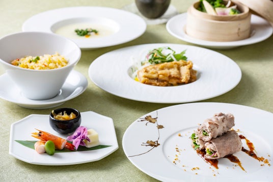 若葉の香りを運ぶ、穏やかな初夏の風をイメージした中国料理コース「翠風」。近江牛と近江鶏を主役に、さっぱりとした味わいに仕立てました。近江鶏はサクサク食感の油淋鶏に、近江牛のサラダ巻きは発酵調味料「豆䋬(トウチ)」を使ったソースでお楽しみいただきます。ジャガイモの冷製スープや季節野菜の蒸籠蒸しなど、初夏らしい爽やかな味わいです。