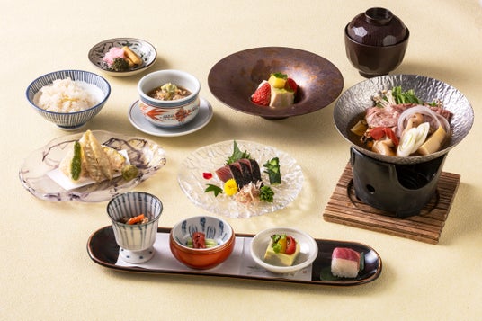 抹茶や煎茶、焙じ茶など、新茶の季節を迎える初夏にそれぞれの香りや旨味を初夏の食材とともにさまざまな料理でお楽しみいただける「会席料理」。おすすめは、滋賀県産の朝宮焙じ茶を使った香ばしいお出汁で味わう近江牛の小鍋。お茶のやさしい香りが近江牛の旨味を引き立て、あっさりとした味わいでお召しあがりいただけます。