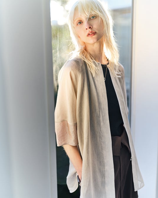 ラグランスリーブシャツ羽織りリネン特有のナチュラルな風合いに、上品な透け感と光沢感を纏ったオリジナルのオーガンジー。驚くほど軽やかでありながら、着映えのするハリ感を兼ね備えた素材は、全行程を愛知県で行っています。