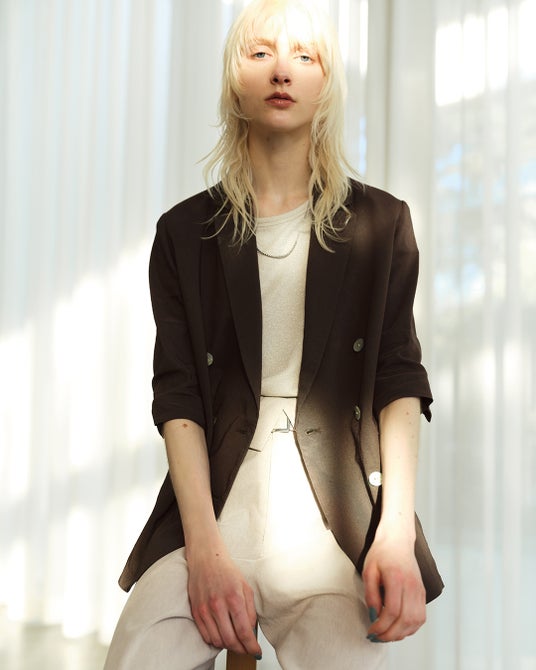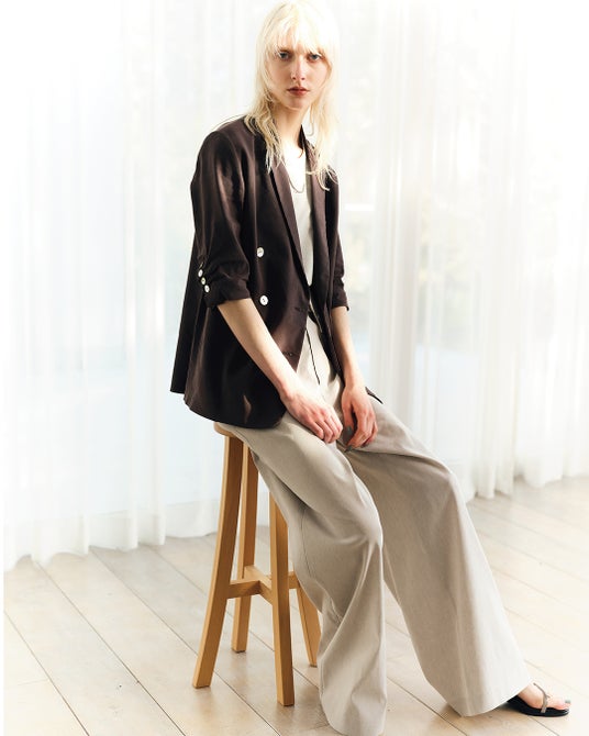 ジャケットは、前を開けてもサマになるこだわりのテーラリングと、袖をたくし上げたようなこなれ感を演出するギャザー入りの七分スリーブが特徴です 。
