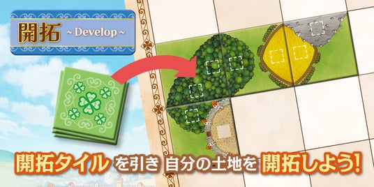 「開拓」で開拓タイルを引き、自分の土地を開拓します。森や町などのエリアがあり、開拓を進めてエリアが完成すると「生産」や「消費」ができるようになります。