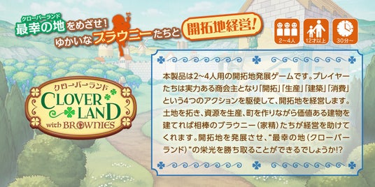 本製品は2~4人用の開拓地発展ゲームです。舞台は大開拓時代を迎えた西の島。プレイヤーたちは島の開拓を担う商人の町の商会主となり「開拓」「生産」「建築」「消費」という4つのアクションを駆使して、開拓地を経営します。土地を拓き、資源を生産、町を作りながら価値ある建物を建てれば相棒のブラウニー(家精)たちが経営を助けてくれます。開拓地を発展させ、"最幸の地(クローバーランド)"の栄光を勝ち取ることができるでしょうか!?