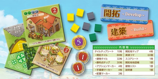 内容物:タイルチップシート10枚(開拓タイル88枚/建物タイル32枚/勝利点チップ30枚/アクションマーカー4枚/手番順マーカー4枚/配置マーカー2枚)・開拓地マップ4枚・資源コマ60個・スコアシート1冊・開拓地地図帳1部・建物リスト1部・説明書1部