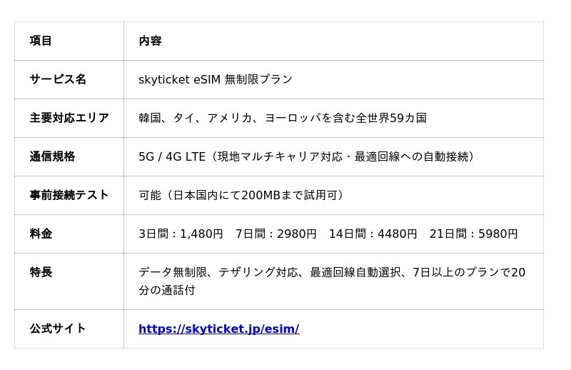 旅行予約サイト「skyticket(スカイチケット)」を運営する株式会社アドベンチャーは、韓国・タイ・ヨーロッパをはじめとする全世界59カ国以上でグローバルで利用可能な「eSIM(イーシム)無制限プラン」の提供を2026年4月15日(水)より開始しました。海外旅行時に、オンラインで即時予約・すぐに利用開始いただけます。