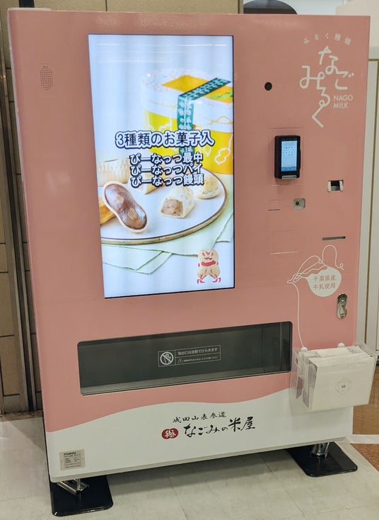 自動販売機の正面は「なごみるく」、側面にはぴーなっつ最中の「ぴーちゃん」のデザインが大きく施され、タッチパネル式の大型モニターには、新浜レオンさんのなごみるくリニューアルやぴーなっつ最中のCMが音声とともに絶えず流れております。