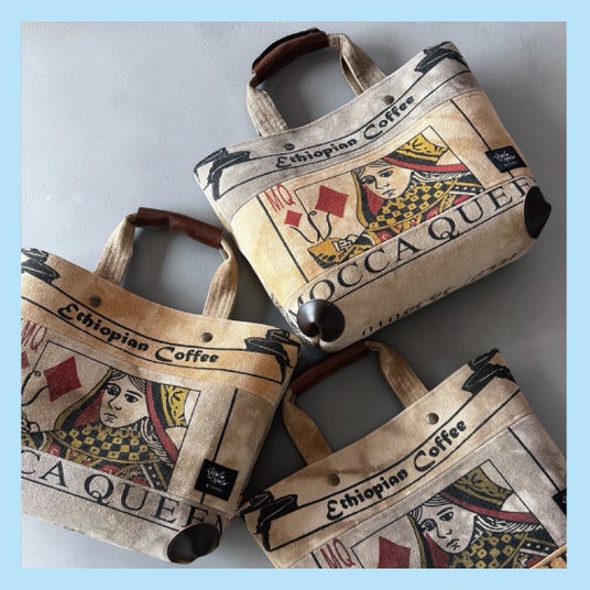 厚木市に工房を構え、夫婦でものづくりを続けるブランドです。コーヒー 豆の運搬で使われた布製の袋をコーヒー染し、バッグに仕立てました。