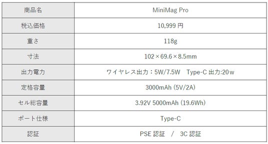 「MiniMag Pro」は、従来の液状リチウム電池の課題であった「熱」と「安全」を克服した、プロ仕様のマグネット式モバイルバッテリーです。