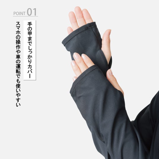 手の甲までしっかりカバー袖口は手の甲まで覆う設計で、日差しが当たりやすい手元までしっかりガード。指先は自由に動かせる仕様のため、スマートフォンの操作や車の運転、自転車のハンドル操作も快適に行えます。