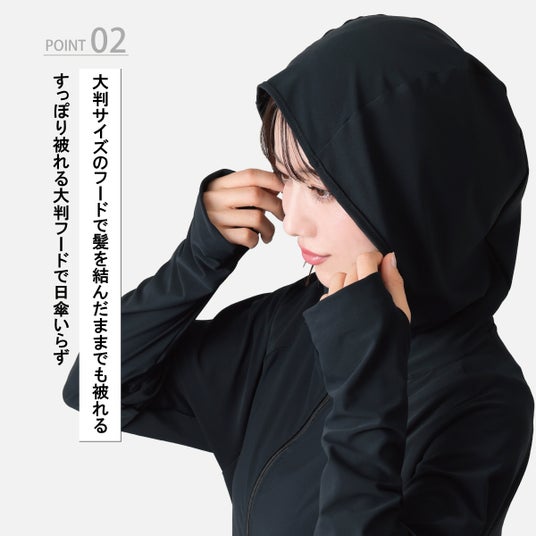 大判サイズフードで日傘いらずゆとりのある大判フードを採用し、髪を結んだままでもすっぽりとかぶれる設計。顔まわりまでしっかり覆い、外出時の強い日差しから守ります。日傘を差しにくいシーンでも活躍します。
