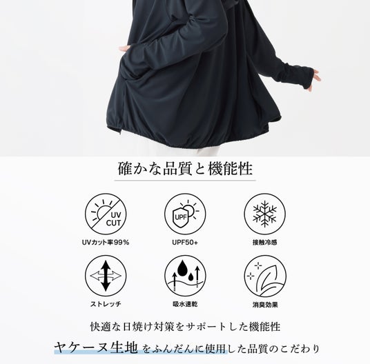 「ヤケーヌ UVカットパーカー」は、シリーズ累計300万枚を突破し、多くのメディアにも掲載されてきたUV対策ブランド「ヤケーヌ」と同じ日本製の高機能糸を使用しています。