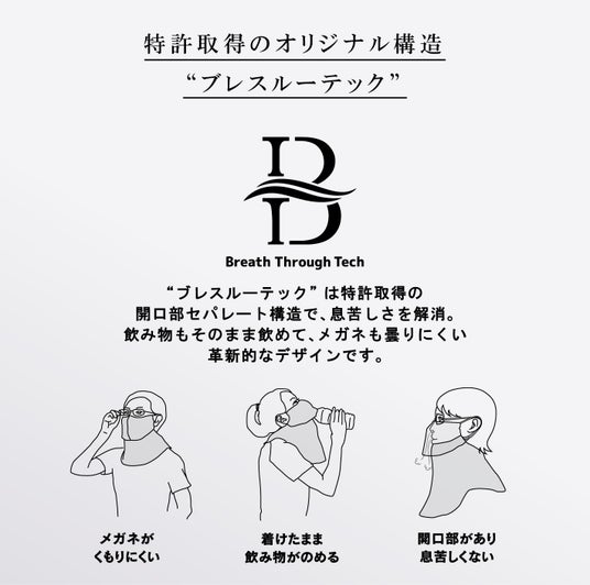 ヤケーヌは、息苦しさを感じにくい構造が特徴のフェイスカバーです。特許取得のオリジナル構造「ブレスルーテック」は、上下二部式のセパレート設計。吐いた息が下に抜けるよう設計され、水分補給やメガネが曇りにくい革新的デザインです。