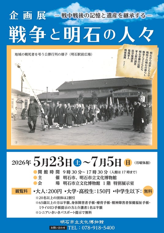 展覧会名:企画展「戦争と明石の人々-戦中戦後の記憶と遺産を継承する-」会期:2026年5月23日(土)- 2026年7月5日(日)